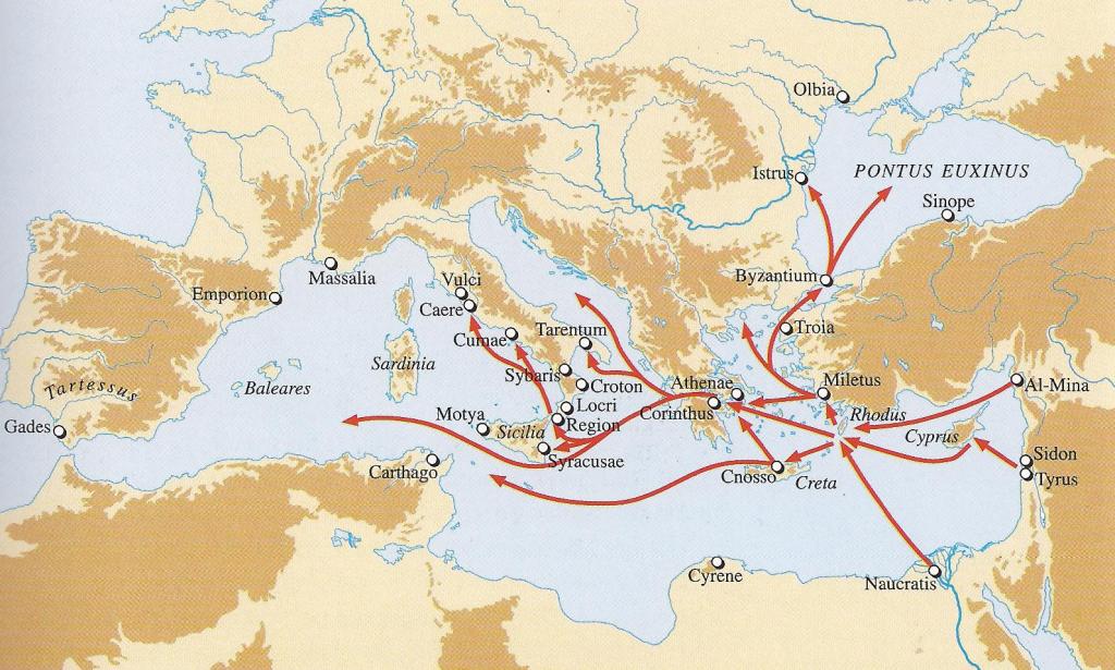 Emprendedores comerciales y colonos agrícolas establecieron una serie de nuevas ciudades griegas desde el Mar Negro hasta el Mediterráneo occidental.