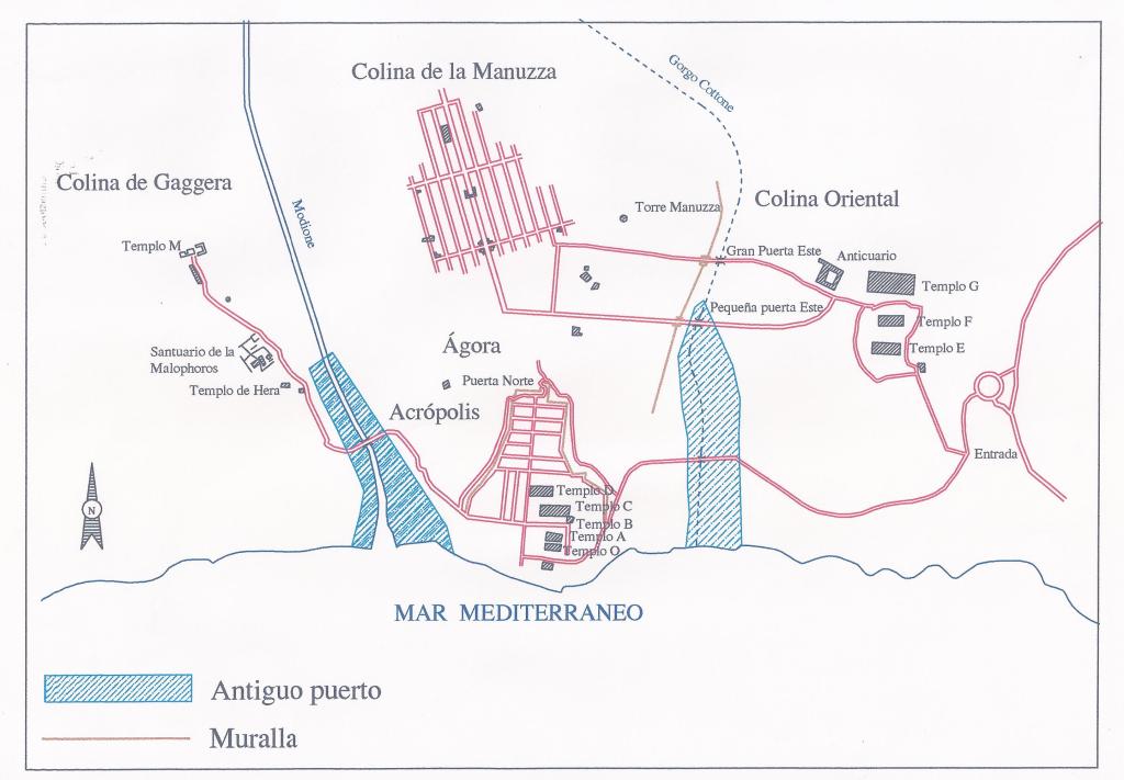 Factor importante en su fundación (628 a.C.) fue la topografía de la zona, con tres colinas (Gaggera, Manuza y Marinella) separadas por dos ríos, el Selinos (actual Modione) al oeste y el Cottone al este, que proporcionaban dos puertos: fluvial el occidental y abierto y profundo el oriental. Una gran dorsal entre las colinas de Manuzza y la colina de la acrópolis se convirtió en el eje vertebrador del planeamiento.
