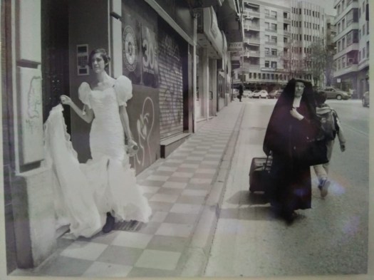Muy cerca de ese apeadero y a través de una muy concreta vinculación con ese poético círculo vicioso magistralmente planteado por el historiador, el bullicioso punto de encuentro llamado “Xúcar” ha servido de pretexto para la propuesta de la fotógrafa Ana Jiménez. Su fotografía, Miradas-1, que se halla hoy en el I.E.S. Fernando Zóbel, de la localidad de Cuenca, fue expuesta en el XXX Certamen de Artes Plásticas anual en honor al propio pintor (Cuenca, febrero de 2018). Con esa imagen tan irreverente e imagino que desconocida para el gran público, Jiménez ha descontextualizado un ecosistema de existencia robótica y macilenta. De esta forma, la ortodoxia se ha fragmentado en pedazos -en esta ocasión, a plena luz del día, quién sabe si en noviembre-. A través de una joven vestida de un clasicismo muy punk y de una monja que camina por la calzada, la fotógrafa le ha dado la vuelta a la vivencia y comprensión de un espacio cualquiera.