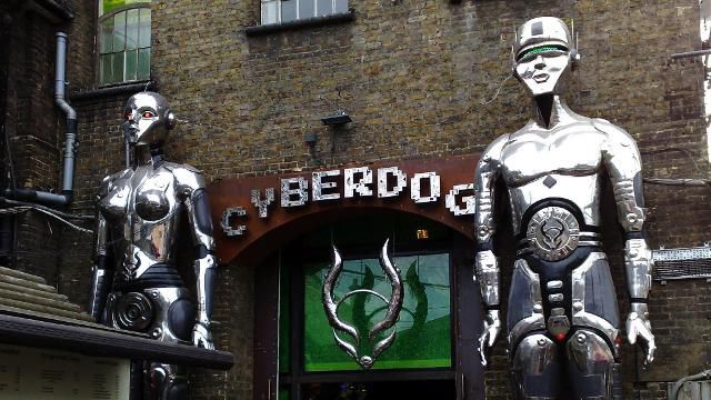 Así, entre la disciplina distópica y el turisteo, nuestra visita se desarrolló en condiciones medianamente agradables. Y nuestras compras (conservo camiseta del perro, claro). Aquello nos gustó y a mi esposa le gustó que aquello me gustase, dentro de la vesícula biliar de ese barrio tan particular que es Camden (en la “Wiki” lo definen por su mercado variopinto y su carácter laberíntico, alternativo y contracultural, a lo que habría que añadir que está petado de gente y que puede resultar en ocasiones insoportable, al menos durante aquel día de mayo de 2016). Pero mola un montón. La tienda, flanqueada por dos androides gigantes en su portada, viene presentada en su propia web como un espacio de ropa de fama universal. Al respecto de ese buque insignia que –dicen- es ese local, se habla de una miscelánea de ropa rave, dance y de calle en el contexto de una sobrecogedora escenografía de una gama de neones y de colores flúor. Se insiste en la música potente e inspiradora durante más de dos décadas. A este tipo de garitos le salen acólitos de debajo de las piedras, hasta el punto de llegar a una conmovedora y deseable balcanización de la movida. Habiendo asimilado pues el aturdimiento, la distopía no habría de ser patrimonio de las élites, coño.