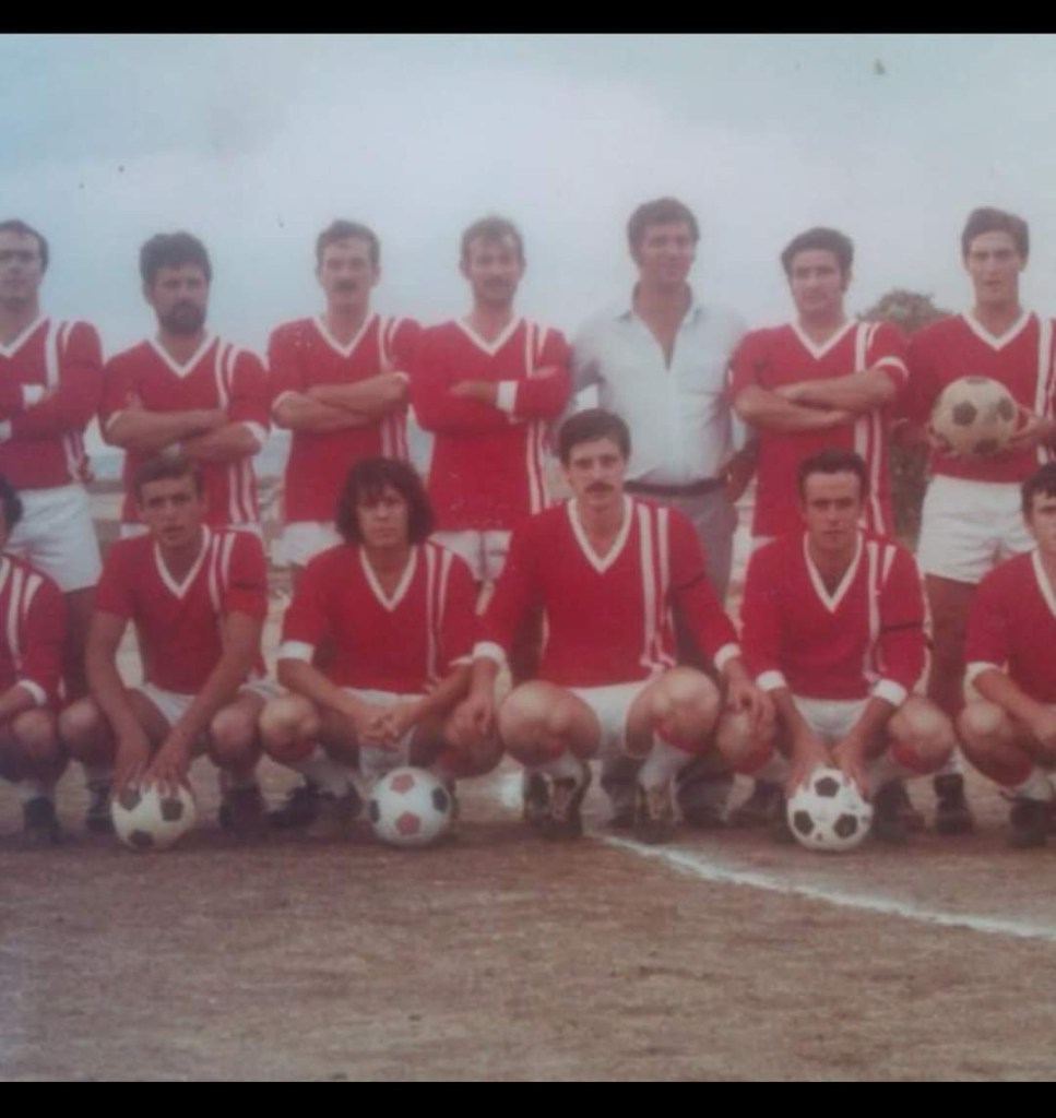 Los protagonistas (mis más sinceras disculpas a los que quedan cercenados en la fotografía), la simbiosis entre un proyecto en estado embrionario y una gloriosa cuadrilla de “Local hero” que con gran derroche de generosidad y sin pensar en la fatiga y el tedioso esfuerzo agarraron pico y pala en mano y comenzaron con gran pasión y entusiasmo ya hace unas décadas a horadar los cimientos y a apostar la primera piedra de su modesta ciudad deportiva, para ellos su “Domus Aurea”, y transformada la crisálida en mariposa demostraron así su esforzada magnanimidad emprendedora. Metamorfosis de un puñado de ilusionados y exultantes zagales que, al concluir la faena, despojarse del mono de trabajo y abandonar el tajo hasta el lunes siguiente tenían que enfundarse otro atuendo, atarse las botas y comenzar una nueva tarea más estimulante, jugar al futbol.