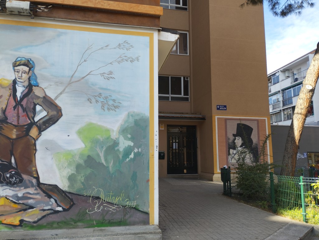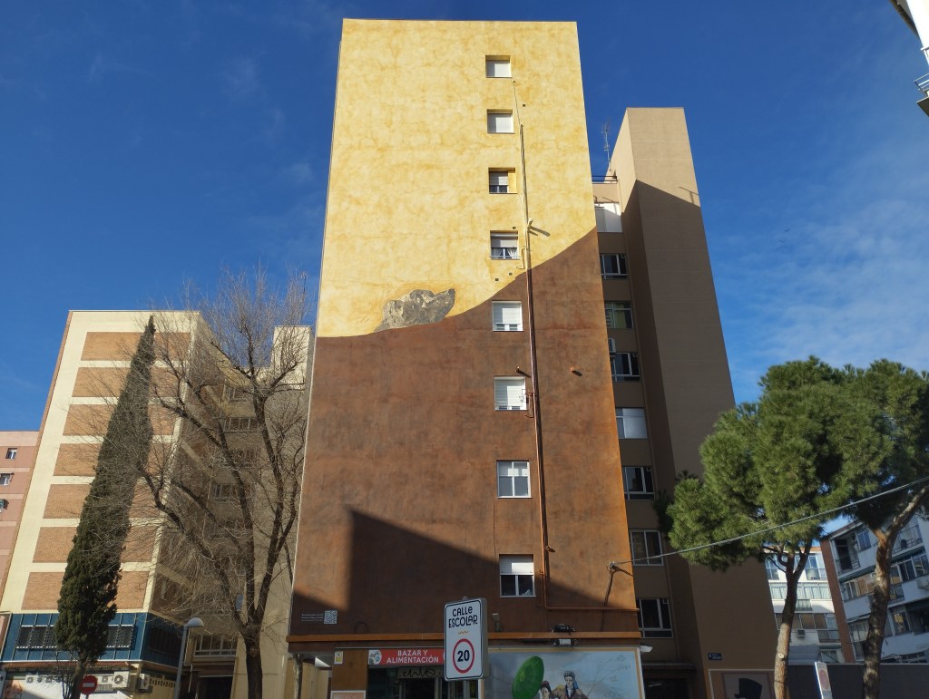 Si usted se mete en Google y escribe “Perro semihundido”, tendría la maravillosa oportunidad de ver un montón de imágenes del Perro semihundido. Imagine las paredes de su casa decorada con láminas de ese lienzo (yo hago gala de una reproducción en la entrada de mi quel). Sin embargo, con El perro y con el mural de El perro, se rompe un poco la dicotomía maniquea habitual. Es una inversión/perversión cósmica en el seno de una mañana plácida, diáfana, muy fría. Y debajo del mural, unos chinos, una reproducción de El Quitasol (1777) y en un portal, un retrato de perfil del aragonés universal (3). Espacio sustrato. Un barrio muy acogedor, pero tuvimos que abandonar aquel prodigioso polinomio del oeste de la ciudad.