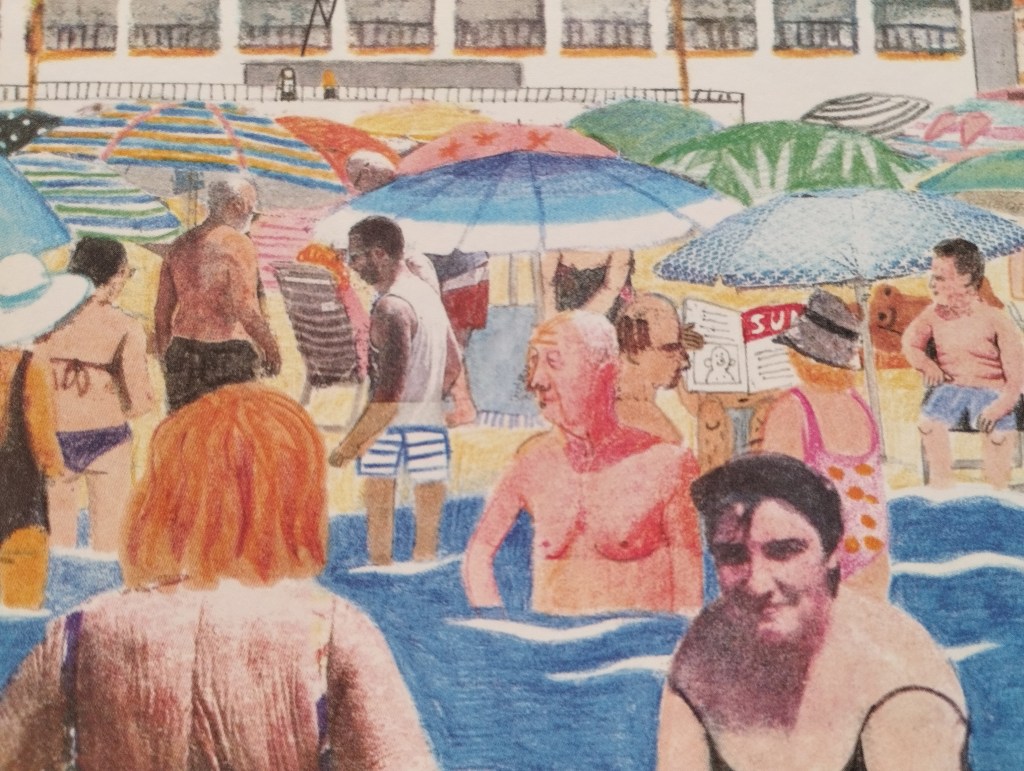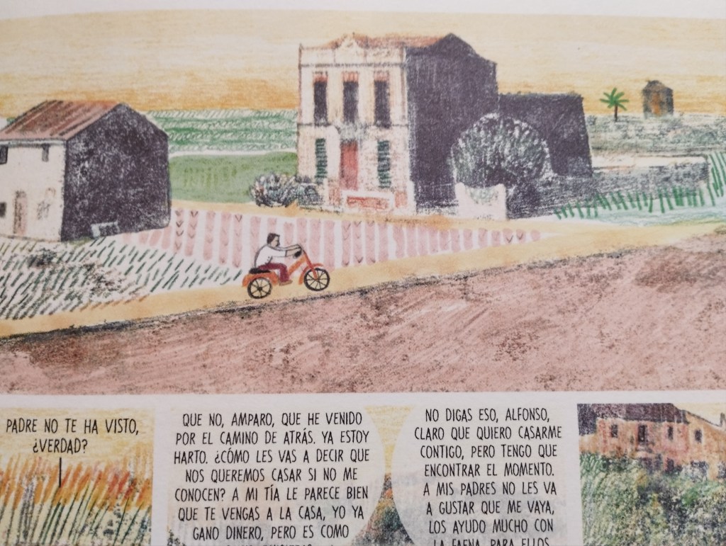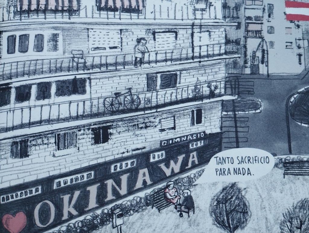 Nada ha quedado al azar. Despertar del letargo. Perplejo me he quedado con esas personas que pululan por las páginas de Penyas, que son en definitiva demoledores estereotipos que resultan hasta inquietantes. Estamos todas bien es más intimista, Todo bajo el sol es en cambio más aparatosa, más febril, la ilustradora transmite una potente sensación de calor, de agobio, de pegamento con el lector/la lectora. Entre los despojos del extrarradio, Penyas ha sabido captar la presión socioambiental del contexto playero y de las masas deformes y, en definitiva, de la congoja. He observado con fruición asimismo la tendencia a la repetición (muy estudiada) de las mismas postales urbanas y de las casas de labor. Por favor, véase en Todo bajo el sol la descripción silenciosa del portal 19, o del de la misma Maruja en un portal 7 de la Alcorcón del llamado “Cinturón rojo” de Madrid. OJO, SPOILER: al final de lo levantino, frente a los cachalotes urbanos, Amparo -la mujer de Alfonso- le pregunta si se acuerda de cuando aquello era huerta, en una escena que vale como prelectio para otras cosas de la vida misma.