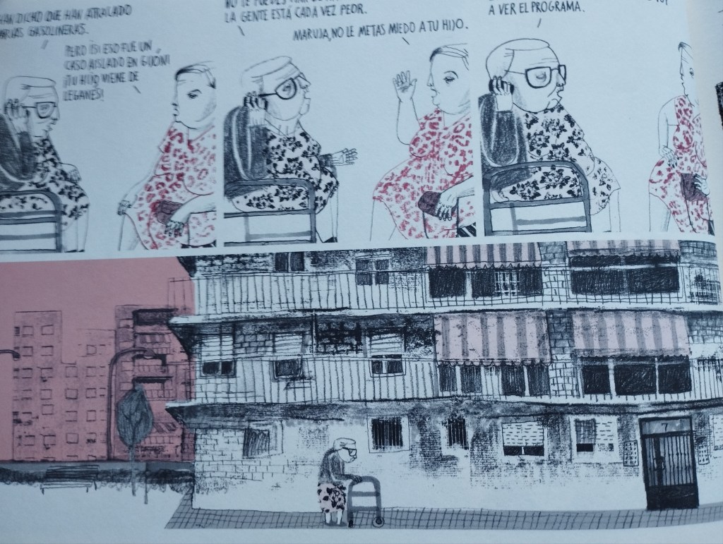 En mi opinión, el modus operandi de Ana Penyas guarda grandes dosis de costumbrismo punk. La narración de las tribulaciones de los de abajo (un costumbrismo muy acusado) es un engranaje de cualidades minimalistas, reivindicativo, simple, potente, descarnado, hasta agresivo y nihilista, con retazos de un rabiosísimo cubismo sintético a cuestas (es decir, un punk de manual). Aclarado esto, ya puedo empezar diciendo que en Estamos todas bien, el urbanismo suburbial se ha desplegado con una uniformidad absoluta (la que viene determinada por unos edificios distintos unos a otros, de 5 a 7 plantas, en la madrileña Alcorcón, por ejemplo), de ventanas a ras de suelo y terraguero. A ras de los bloques, apenas hay aceras –o no se quieren poner aceras, lo cual me parece bastante intuitivo y por supuesto inteligente-. En esa localidad del suroeste de Madrid, los espacios son enormes y solitarios, de tintes opacos. En una de las viñetas, se dibuja la monotonía existencial de la abuela Maruja, que ocupa una pequeñísima parte de la imagen (un fifty/fifty sorprendente y hermoso de personaje y de tramoya, dos mundos que coexisten a la larga en un círculo vicioso estremecedor).