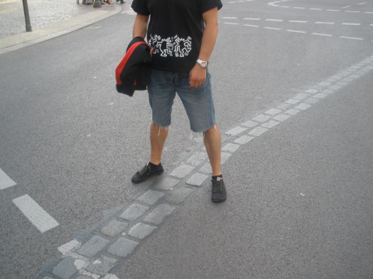 Dentro de la verborrea lagrimal de la capital alemana, merodea una ingente cantidad de elementos categóricos que interaccionan en el marco de un exiguo marco espaciotemporal, como las dos líneas de adoquín que les muestro y que se hallaban enfrente de una cadena de cafés, que indicaban que el Muro (die Mauer) pasaba por allí. Mis piernas reposaban a ambos lados de algo que fue pared una vez y que ha servido para salvar las formas indelebles del turismo, para que vayamos allí y para que yo flipe y escriba sobre todas estas cosas de una puñetera vez -el adoquinado penetraba muy sexualmente, sin sutilezas, en el interior vaginal de la franquicia o la franquicia se lo hacía con el adoquinado abierto en canal, qué más me da-.