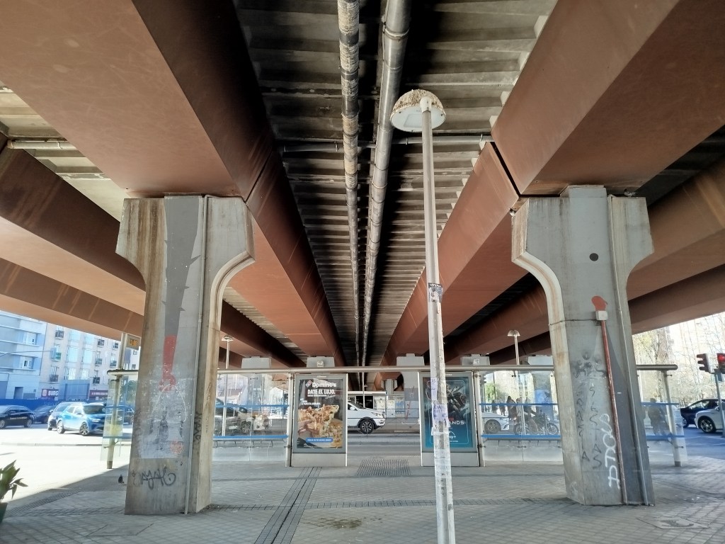Con todo, salir de ese subterráneo es un hostión de realidad laminada. El espacio que acontece, exageradamente liminal, es una sucesión de lentas capas de distorsión que ocurren entre los dos distritos mencionados, se trata un rodal inmersivo y acumulativo de tránsito, tráfico, autobuses, hormigón, ruido, conciencia vecinal, acrimonia desidealizada, la dignificación del humanismo industrial a pequeña escala. La poesía se escruta en él a través del elemento puramente físico y de la ponencia y permanencia infraestética del drone social. El tiempo lineal desaparece por lo tanto de la escena porque en ella se superponen múltiples narrativas como en aglomerado, la periodicidad queda subyugada a un hipertexto vital sampleado sin sentido direccional como resultado de la yuxtaposición de la basura. Es cut-up emocional, material rítmico y atmosférico prolongado a través de variaciones mínimas. En consecuencia, el puente se asimila mediante links ajustados a las diferencias mínimas de ese desajuste temporal.